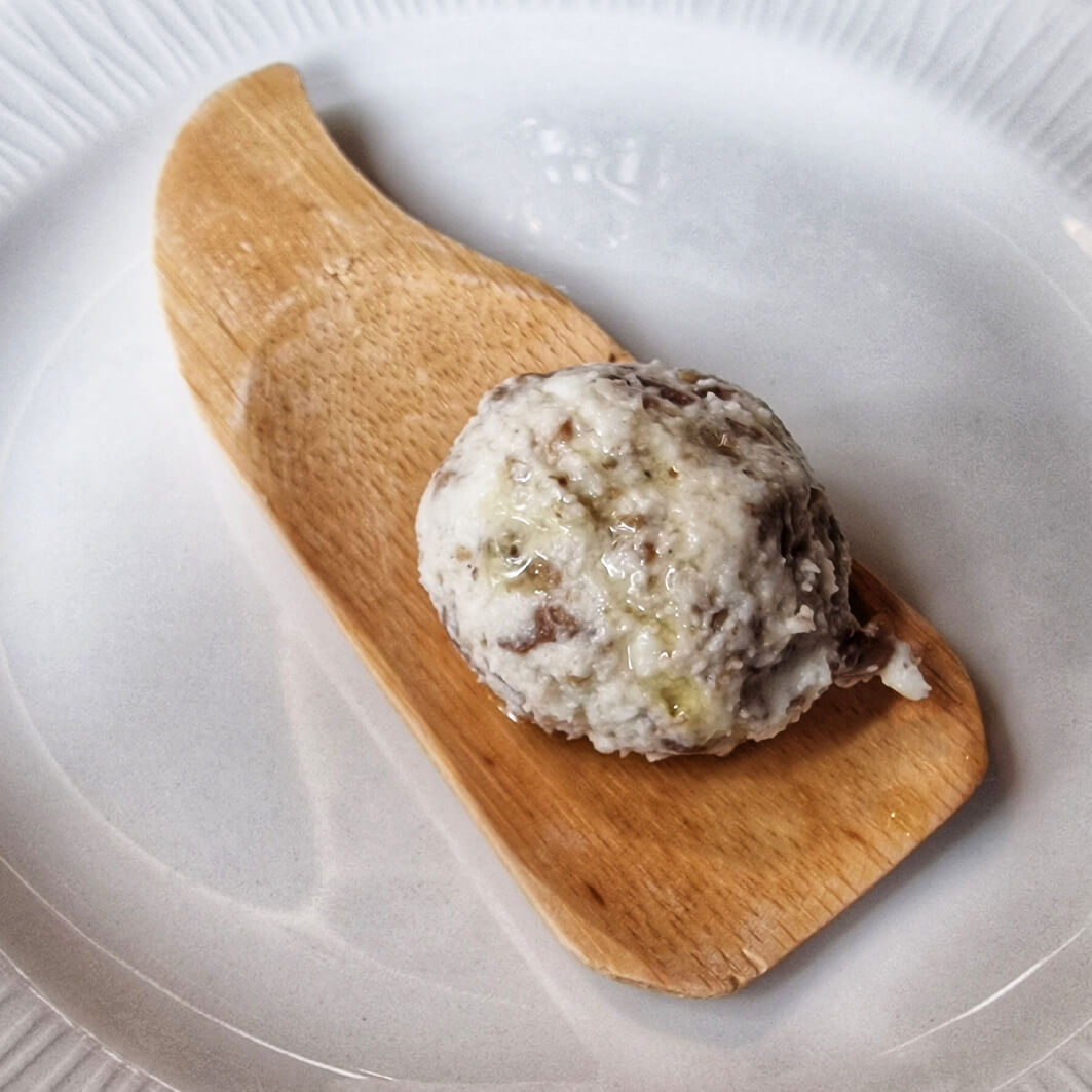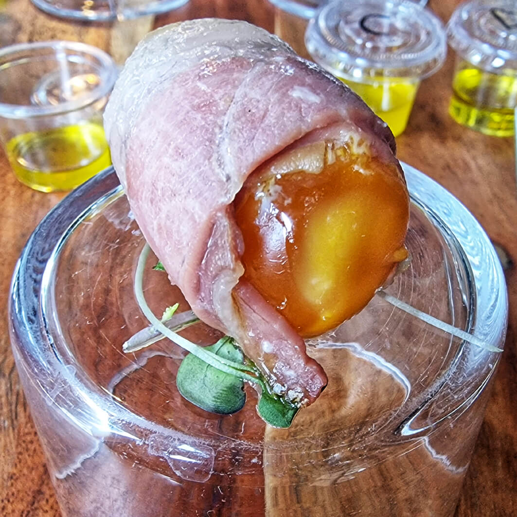 A continuación, el chef ha presentado la “Joya del Ambigú”, una yema de huevo texturizada con Jamón de Teruel DOP Para su elaboración, ha elegido OL10, un AOVE suave y equilibrado elaborado por la Cooperativa Agrícola de Borja que es, según el responsable de la almazara, Ricardo Miguez, «muy agradable, dulce y con un picor y amargor muy equilibrados».