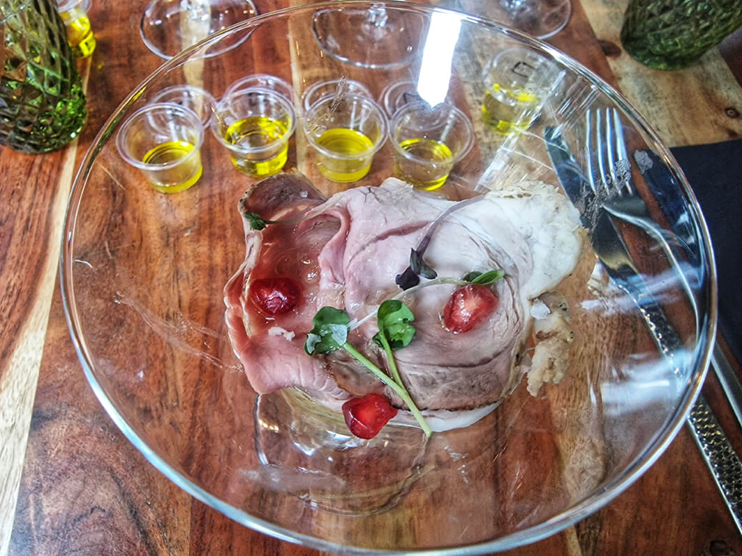 La presentación en formato menú degustación ha corrido a cargo del chef Pedro Martín. Antes de comenzar, Antonio Tejero, el jefe de sala, ha presentado los vinos con los que se han maridado las tapas, «un Bole blanco fermentado sobre lías y una Garnacha Centenaria», ambos de cooperativas productoras de Aceite Sierra del Moncayo. Además, César Cólliga -director técnico del CRDOP-, ha hecho hincapié en el uso «de alimentos de Aragón de calidad diferenciada», como muestra de la estrecha colaboración de la DOP Aceite Sierra del Moncayo con el resto de las figuras de calidad.
