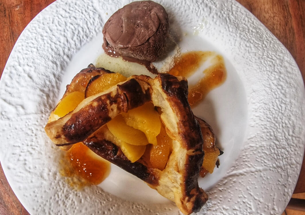El toque dulce ha llegado de la mano de El Gastrónomo Gourmet y su AOVE premium Caius, elaborado también por la Cooperativa Santo Cristo de Magallón «con presencia mayoritaria de aceitunas arbequina y otras variedades minoritarias», como ha descrito Palacios. Sus frutados de aceituna verde, tomatera y almendras verdes y su amargor y picante bien equilibrados armonizan muy bien, ha resaltado el chef, con el “Hojaldre de melocotón de Calanda en almíbar con helado de chocolate y AOVE” con el que se ha puesto fin a esta fiesta de los nuevos aceites Sierra del Moncayo DOP.