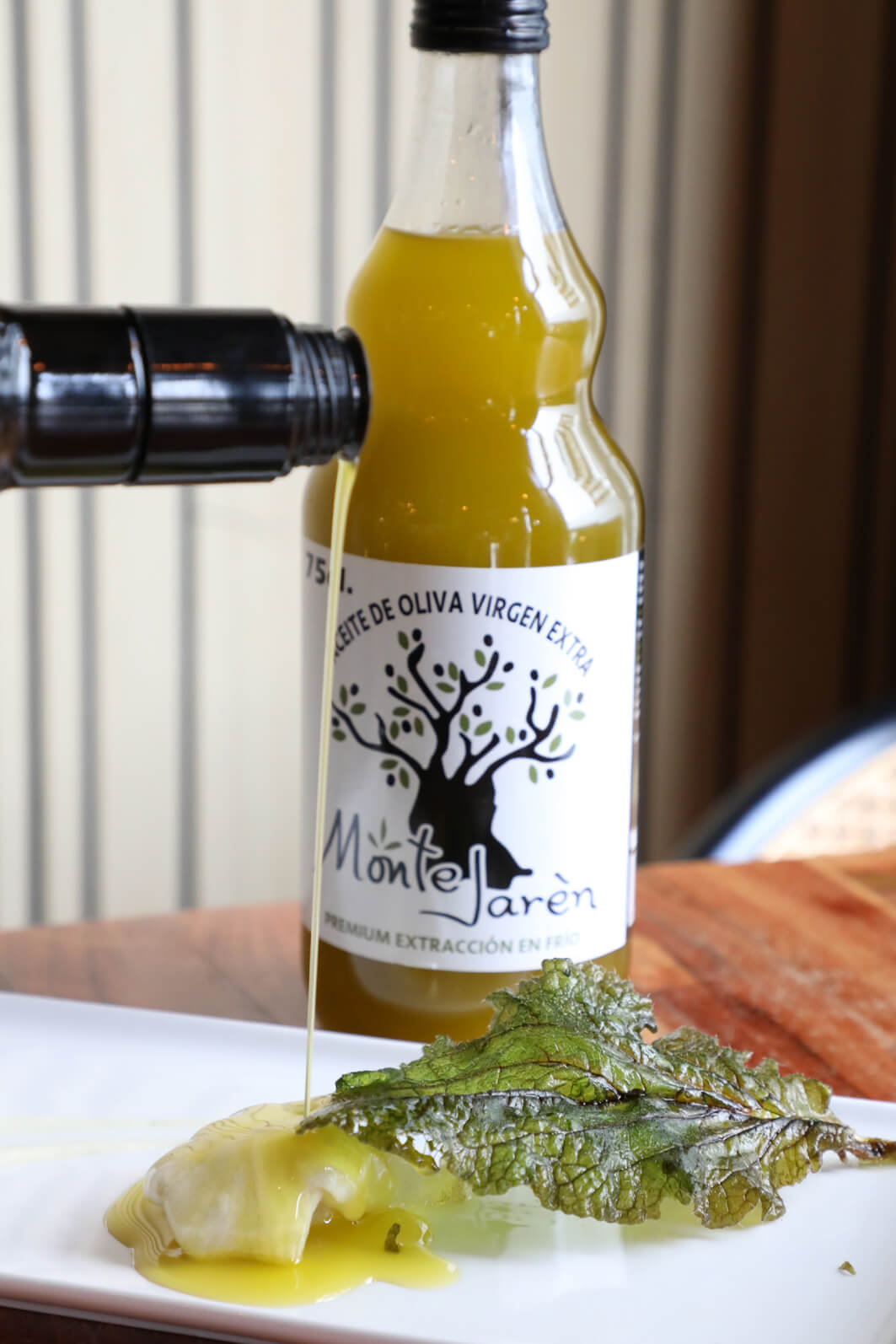 Para la “Cococha al pilpil sobre crujiente de borraja” servida después, el cocinero ha empleado Monte Jarén, «un AOVE que da al pilpil una textura sedosa», ha comentado. Jorge Roy, «aprendiz de maestro almazarero y cuarta generación de Aceites Ambel, la única almazara privada de la DOP», ha descrito este aceite elaborado sobre todo con empeltre seleccionado, que presenta un «frutado ligero de frutos secos y notas florales, resultando equilibrado en boca y con un final dulce y bien integrado».