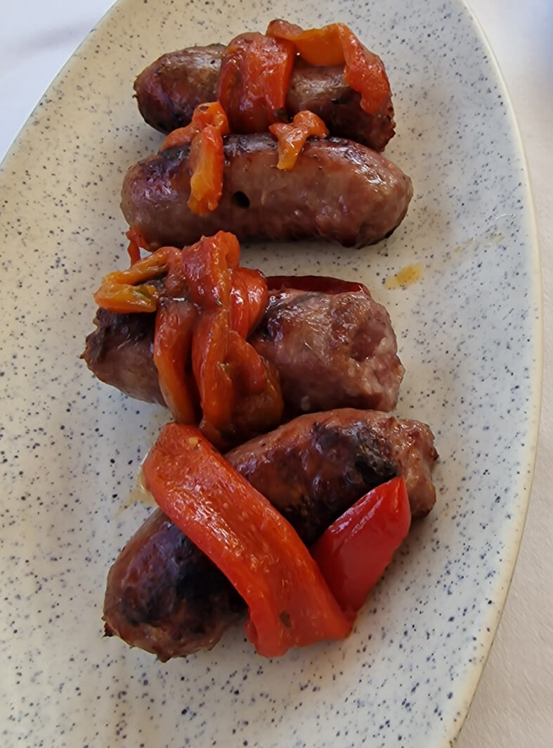 Longaniza de Aragón con pimientos rojos de Santa Engracia braseados a la llama.
