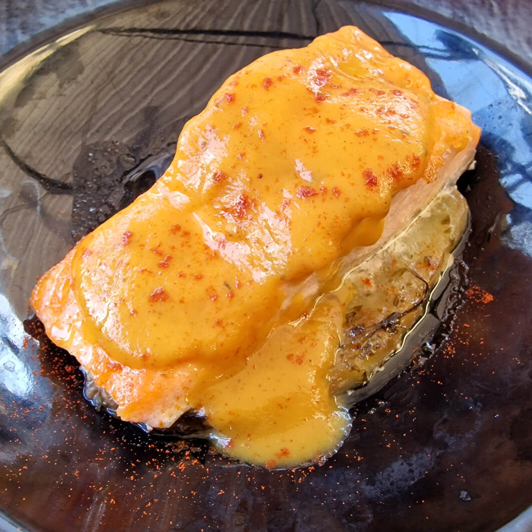 Trucha de El Grado (Pirinea) al horno con salsa de escabeche.