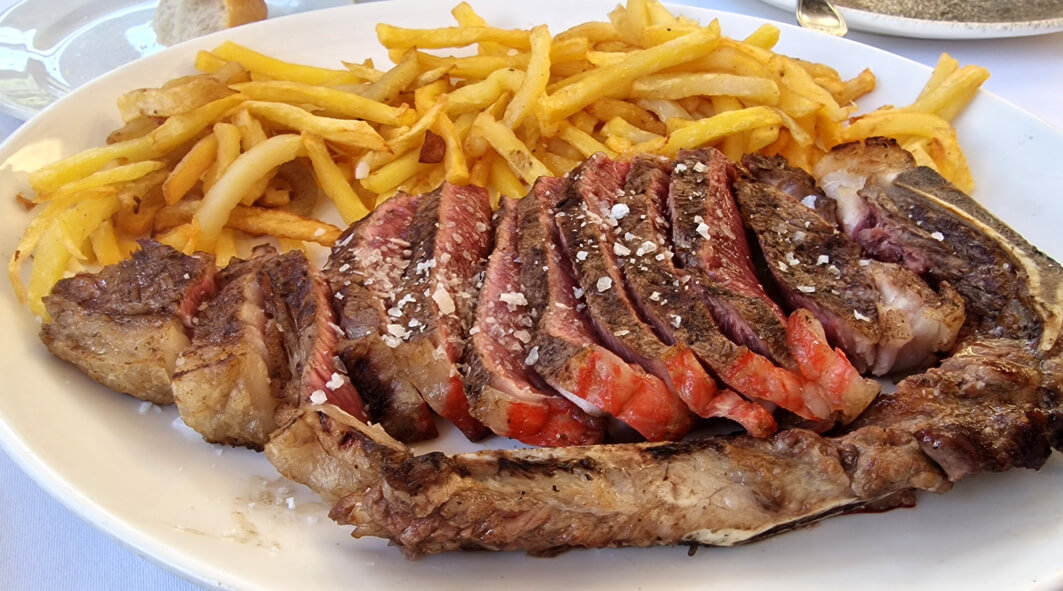 -Chuleta de ternera Piritaurus de Tardienta a la brasa con guarnición.
