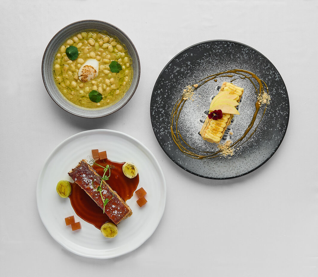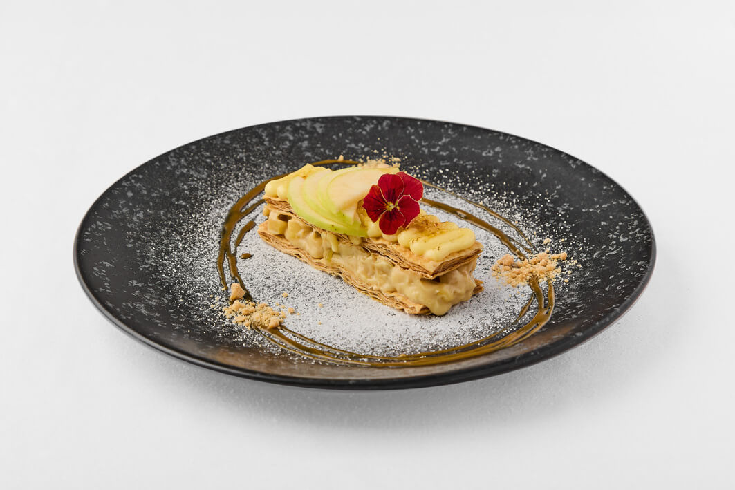 La carta cierra con una composición exquisita hecha postre: “Milhojas de manzanas asadas y crème brûlèe” un final perfecto que condensa la calidez y el dulzor del otoño.