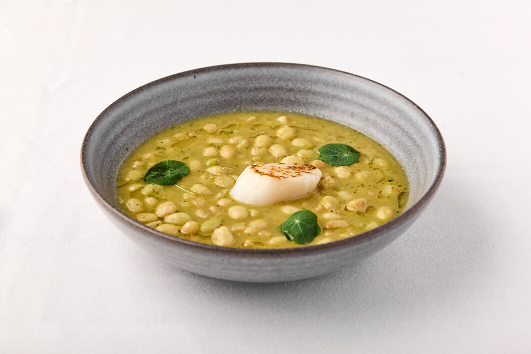 El recorrido sigue con el Guiso de pochas en salsa verde de calamar, vieira braseada y picada de almendra y perejil que combina tierra y mar en un plato de sabores redondos y sutilmente tostados.