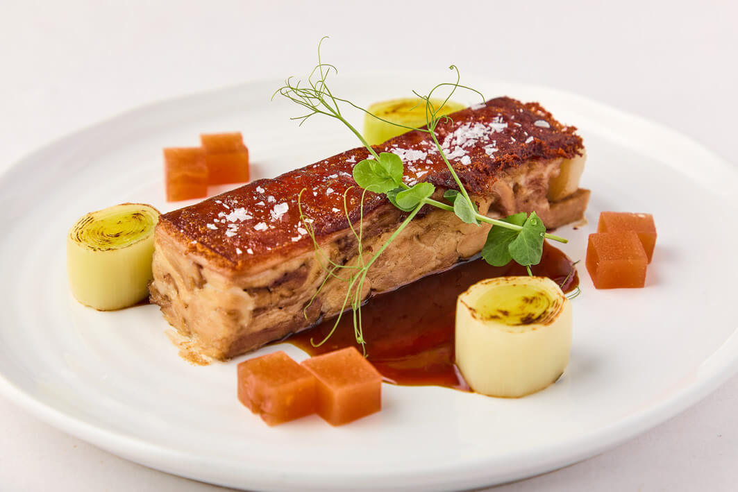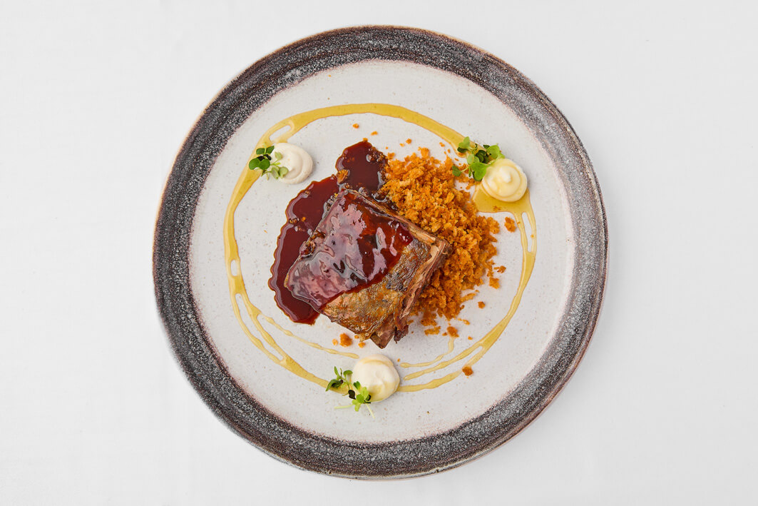 La Terrina de Ternasco de Aragón I.G.P., uno de los sellos de identidad de Celebris, se acompaña esta vez de migas aragonesas, requesón con miel y reducción de sus jugos a la garnacha. Un plato que juega con el matiz dulce salado a través de ingredientes que representan icónicos platos de nuestra gastronomía.