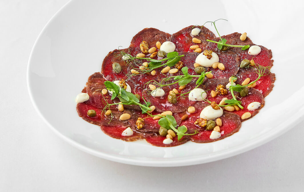 El Carpaccio de ciervo, acompañado de brotes de berros, alcaparras y piñones tostados, equilibra lo rústico y lo elegante en una propuesta llena de matices a los que se añade un aliño de mostaza que los intensifica.