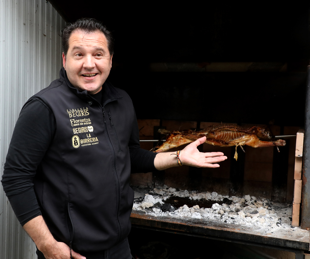 David Royo, propietario de la Sidrería Begiris preparando el cordero lechal al espeto (Foto: Cristina Martínez)
