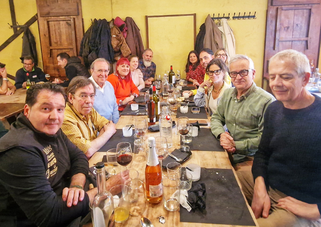 Foto de familia de los periodistas y el propietario de la sidrería Begiris, David Royo (a la izquierda).