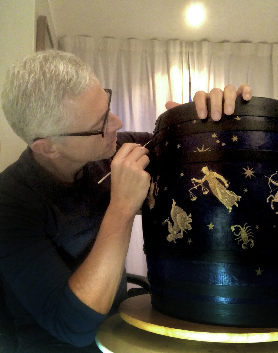 El pintor sanluqueño Marco Oliva trabajando en la decoración del barril de Vermut Atamán para el Buque Escuela